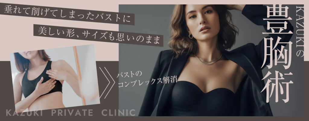 KAZUKIプライベートクリニックの豊胸施術では、豊胸バッグによるサイズアップからヒアルロン酸注入による自然なバストライン形成まで、幅広い方法を提案しています。年齢や体型、希望に応じてデザインを調整でき、立体感や理想の形を目指すことができます。カウンセリングは無料で、丁寧に悩みを聞いたうえで最適な豊胸プランを一緒に考えてもらえます。