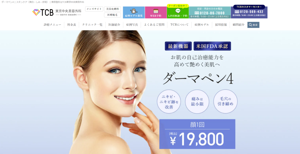 TCBでは、ヴェルベットスキンのダーマペンが有名です。コラーゲンピールと組み合わせる施術で、美容成分をたっぷりと浸透させることで、ニキビ跡だけでなく、くすみ、こじわ、たるみの改善を期待できます。
