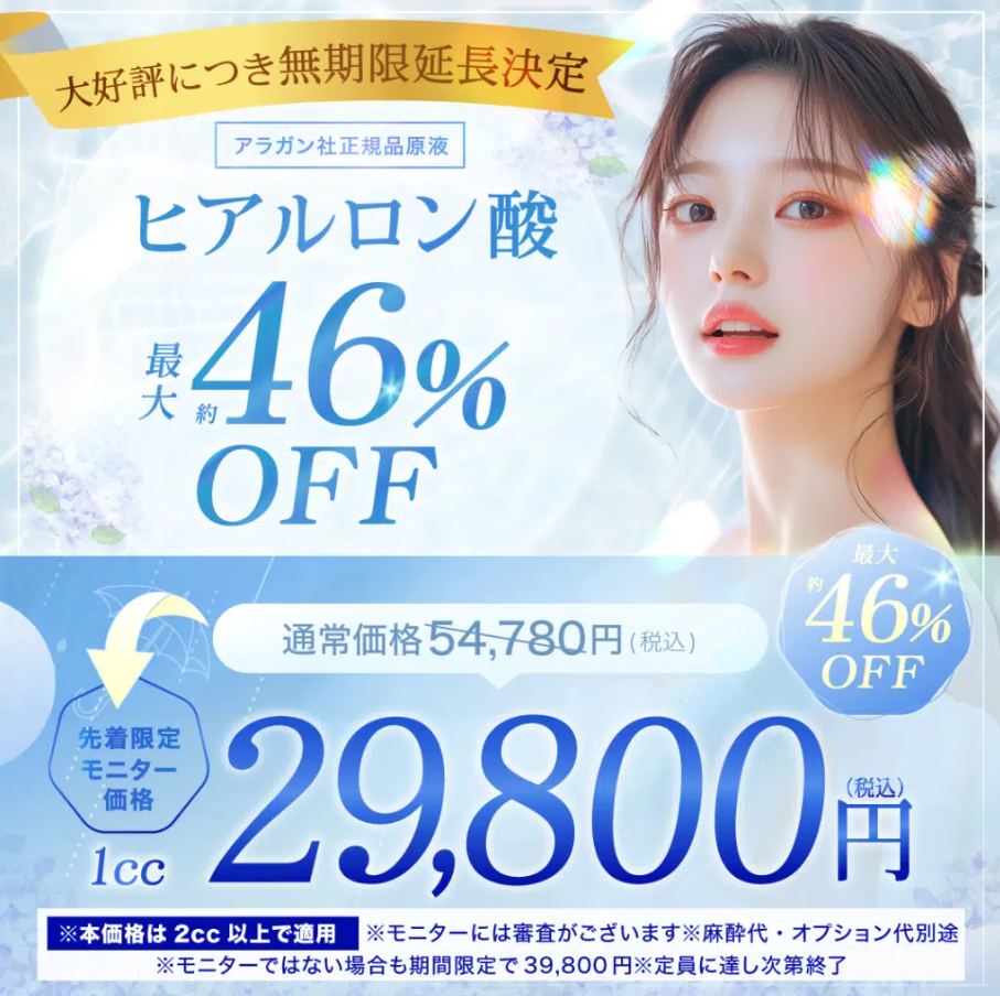 | ヒアルロン酸注入 | 1cc/19,200円~ ※部位によって価格は異なります。 |