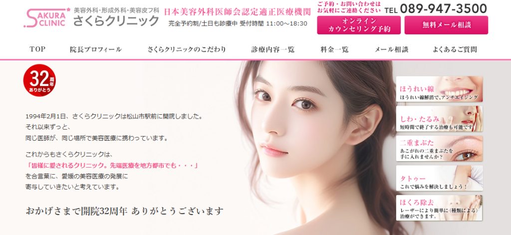 福井 卓也院長は東邦大学医学部卒業後、美容外科・形成外科で30年以上のキャリアを持つ専門医で、松山市にさくらクリニックを開院し長年患者を診療してきました。豊富な手術経験を活かし、脂肪吸引を含むボディデザイン治療にも対応し、安全性と自然な仕上がりを重視した丁寧な施術を行っています。