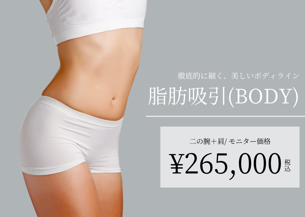 | 脂肪吸引(BODY) | 二の腕+肩 360,000円 二の腕+肩+肩甲骨横 460,000円 二の腕+肩+上背部 600,000 円 内もも 360,000 円 腰+ウエスト 510,000円 下腿+足首 460,000円 |