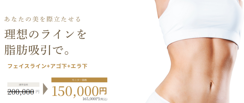 | 脂肪吸引セット | フェイスライン+あご下+エラ下 220,000円 肩+二の腕 275,000円 太もも全周+ひざ回り 550,000円 上腹部+下腹部+ウエスト+ウエスト上部 715,000円 |