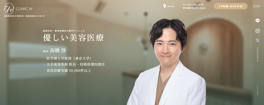 高橋 医師は、東京大学で医学博士号を取得し、大手美容外科で高崎院・品川院の院長や技術指導医を歴任。2024年にCLINIC Wを開院し、「優しい美容医療」を信条に、目元整形やクマ治療、さらには顔の脂肪溶解注射をはじめとする痩身治療を含め、豊富な経験と高い技術で自然な美しさを提供しています。