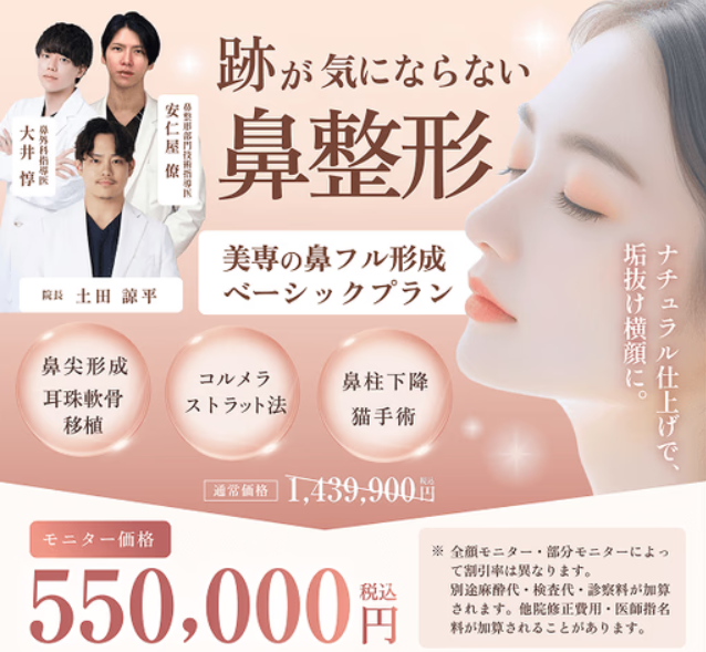 | 鼻先の整形 | 鼻尖形成術(大鼻翼軟骨の幅寄せ+鼻柱、鼻尖部への耳介軟骨の移植) 660,000円 |