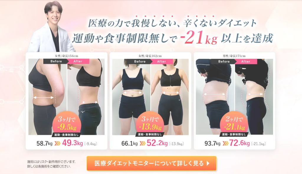 など、「ダイエット」が上手くいかない人も多いでしょう。一生懸命やってもなかなか効果が出なかったり痩せるのは難しいです。そこでおすすめなのが医療ダイエットです。医療ダイエットといえば「脂肪吸引」のようにメスで表皮を傷つけるような施術を思い浮かべるかもしれませんが、最新の医療ダイエットであれば全く傷をつけずにダイエットを成功させることができます。
